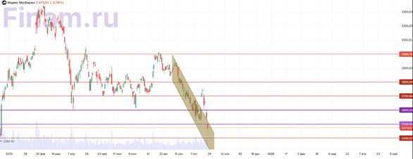 С точки зрения теханализа, на дневном графике Индекс МосБиржи пробил все уровни поддержки и вернулся в нисходящий канал, который был сформирован в сентябре 2025 года. Индекс выглядит крайне слабо, при этом перепроданность уже присутствует (RSI составляет 33 пункта, что уже недалеко от сильной перепроданности), однако технически ожидается продолжение падения до нижней границы канала и уровня поддержки 2400 пунктов.