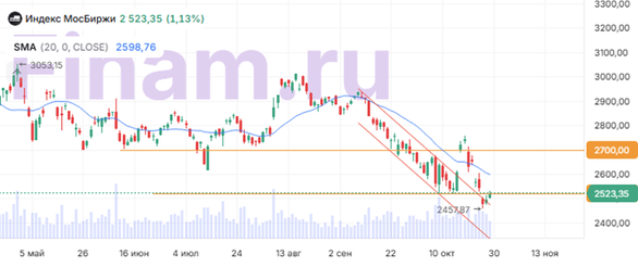В среду российский рынок акций демонстрировал умеренный рост и консолидацию на фоне локального затишья в геополитической повестке. Индекс МосБиржи к вечеру закрепился в районе 2523 пунктов (+1,1%), отыграв утренний коррекционный импульс и уходя от минимумов. В плюсе завершили сессию бумаги ряда металлургов и энергетических компаний, хотя поддержка со стороны внешнего фона оставалась сдержанной — неопределенность относительно новых санкций и перспектив дальнейших шагов ЦБ по ставке сохранялась. В центре внимания инвесторов сегодня оказалась отчетность «Яндекса»: компания по итогам III квартала превзошла ожидания рынка, увеличив выручку на 32% и скорректированную EBITDA на 43% по сравнению с прошлым годом, а также повысила прогноз по прибыльности на весь 2025 год, что вызвало рост акций на 2,4%. Среди прочих лидеров роста сегодня: «Вуш Холдинг» (+4,46%), «Полюс» (+4,06%), «Татнефть» ао (+3,60%), «Татнефть» ап (+2,88%), «Распадская» (+2,78%), «Норникель» (+2,41%), «Абрау-Дюрсо» (+2,37%), ПИК (+1,71%), «Мечел» ап (+1,56%), «Ростелеком» (+1,46%). Аутсайдерами сегодняшней сессии стали: «Башнефть» (-2,33%), «Мосэнерго» (-1,67%), СПБ Биржа (-1,57%), «Северсталь» (-1,41%), «Лукойл» (-1,32%), ВК (-1,10%), «Инарктика» (-1,08%), БСП (-1,01%), «Интер РАО» (-1,00%), «ФосАгро» (-0,94%). Из новостных драйверов дня выделялись комментарии Минфина о готовности корректировать бюджет 2026 года при необходимости и заявления главы ЦБ о выдержанном подходе к денежно-кредитной политике. Рынок ожидает публикации свежих данных по инфляции и потребительским настроениям, которые могут скорректировать траекторию индекса в ближайшие дни. В целом инвесторы осторожны: несмотря на локальный отскок и позитивную корпоративную отчетность отдельных компаний, отсутствие сильных внешних катализаторов и сохраняющиеся риски давления на экспортеров удерживают активность в сдержанных рамках. Технический анализ Индекс МосБиржи Индекс МосБиржи пытается выйти из нисходящего тренда: он вернулся к уровню выше поддержки 2521, давление продавцов снизилось. В ближайшей перспективе наиболее вероятен сценарий консолидации в диапазоне 2520–2700 до появления новых сильных рыночных драйверов. Для формирования устойчивого «бычьего» сигнала необходим пробой и закрепление выше линии 20-дневной SMA, которая проходит сейчас на уровне 2599, и роста объемов торгов.