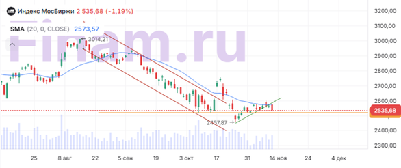 Российский рынок акций в среду продолжил снижение, оказавшись под давлением слабеющей нефти и отсутствия новых позитивных драйверов. Индекс МосБиржи к вечеру просел на 1,2% и закрепился ниже отметки 2536 пунктов, полностью утратив утренний импульс роста. Дополнительное давление на рынок оказали просадка нефти Brent ниже $63,2 за баррель (-3%). Геополитический фон оставался напряженно-нейтральным. На первый план снова вышли вопросы санкционного давления: стало известно о новых ограничениях на использование британских морских услуг для перевозки российского СПГ, что усиливает изоляцию российского экспортного сектора. Пресс-секретарь президента России Дмитрий Песков подтвердил рост милитаристских настроений в Европе и существенное увеличение военных бюджетов стран ЕС, что инвесторы воспринимают как долгосрочный риск для экономики и общих перспектив региона. Вместе с тем помощник президента России Юрий Ушаков подчеркнул, что договоренности, достигнутые между Путиным и Трампом в августе в Анкоридже, формально остаются в рабочем состоянии, несмотря на замедление реального диалога по украинскому вопросу. Такие сигналы не позволяют рынку надеяться на быстрое улучшение внешней повестки и скорее поддерживают стратегию осторожности. В корпоративном сегменте основное внимание было приковано к бумагам ЛУКОЙЛа, которые потеряли 4,4% и обновили минимальные значения за последние полтора года. Причина — усиление санкционного давления и невозможность компании продолжать работу на стратегически важном месторождении в Ираке. Прочими лидерами падения стали: «Вуш Холдинг» (–3,48%), «Совкомфлот» ПАО (–3,01%), «НоваБев Групп» (–2,39%), «РуссНефть» (–2,34%), Группа «Позитив» (–2,21%), ДВМП (–2,20%), «Норникель» (–1,97%), «Транснефть» а.п. (–1,97%), «Мечел» а.п. (–1,87%). Выросли против рынка: «СОЛЛЕРС» (+4,56%), ОВК (+1,61%), «Селигдар» (+1,32%), ТМК (+1,06%), «М.Видео» (+0,72%), «Россети Центр и Приволжья» (+0,35%), «КАМАЗ» (+0,25%). Технический анализ Индекс МосБиржи В ближайшие сессии для Индекса МосБиржи ключевым ориентиром станет 20-дневная скользящая средняя (2573). Закрепление выше этого уровня станет бычьим сигналом продолжения восходящего тренда. Если индекс не преодолеет SMA 20 и останется вялым, вероятна консолидация в боковике 2500–2600 до появления новых драйверов.