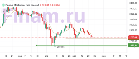 В пятницу, 23 мая, российский фондовый рынок завершил основную сессию в красной зоне. Индекс МосБиржи снизился на 0,79% до 2770,1 пункта, а долларовый РТС упал на 0,76% до 1094,76 пункта.