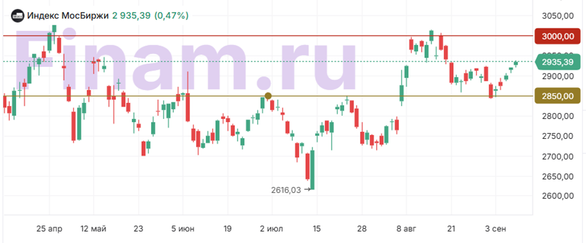 Российский фондовый рынок во вторник, 9 сентября, демонстрировал преимущественно позитивную динамику на фоне укрепления цен на нефть и сохранявшихся ожиданий смягчения денежно-кредитной политики со стороны Банка России. Инвесторы исходят из высокой вероятности снижения ключевой ставки уже 12 сентября, что поддерживает аппетит к риску. Дополнительный фактор оптимизма связан с признаками замедления инфляционного давления, усиливающими аргументы в пользу более мягкой политики регулятора. Вместе с тем рост рынка сдерживался сохраняющимися геополитическими рисками и возможным расширением санкций США и ЕС, в первую очередь в отношении нефтегазового и банковского секторов. На настроениях инвесторов также отразились заявления президента США Дональда Трампа о планах переговоров с российским лидером и европейскими партнерами по урегулированию украинского конфликта. Эта риторика придала рынку дополнительный информационный импульс, хотя ее влияние пока остается ограниченным. К завершению торгов стоимость нефти Brent поднялась до $66,7 за баррель (+1,0%) на фоне опасений перебоев с поставками при усилении санкционной риторики. На валютном рынке рубль ослабел: доллар укрепился до 85,9 руб. (+4,3%). По итогам основной сессии Индекс МосБиржи продемонстрировал рост на 0,47% до 2935,4 пункта, долларовый индекс РТС упал на 0,62% до 1110,87 пункта. Лидерами роста стали бумаги «Полюса» (+2,56%), «Сургутнефтегаза» (+2,53%), «Северстали» (+2,39%), НЛМК (+2,39%), «М.Видео» (+2,30%), «Роснефти» (+1,97%), «РУСАЛа» (+1,70%), «Селигдара» (+1,68%), «Мечела» (+1,36%), ТГК-1 (+1,29%). В минусе между тем завершили сессию акции ДВМП (-1,28%), «Транснефти» (-1,26%), БСП (-0,96%), «Мосэнерго» (-0,93%), ВК МКПАО (-0,90%), ТМК (-0,85%), «Самолета» (-0,83%), «КАМАЗа» (-0,73%), «Газпромнефти» (-0,73%), «НоваБев Груп» (-0,67%). «Сбербанк» отчитался по РСБУ за 8 месяцев 2025 года о росте чистой прибыли на 6,4% (г/г) до 1,12 трлн руб. При этом рентабельность капитала составила около 22,2%. Чистая прибыль в августе выросла на 3,7% (г/г) до 148,1 млрд руб. Между тем кредитный портфель банка увеличился: корпоративный на 2,1% до 28,5 трлн руб., розничный на 1,3% до 17,8 трлн руб. Умеренно позитивный сигнал для акций, акцент на дивиденды и динамику кредитования. «Эталон» сообщил о планах разместить до 400 млн дополнительных обыкновенных акций по открытой подписке на Московской бирже (номиналом 0,006 руб. за акцию). Цена размещения будет определена исходя из рыночной стоимости после окончания срока преимущественного права. ВОСА по данному вопросу назначено на 29 сентября 2025 г. Инвесторам, интересующимся российским рынком акций, мы по традиции рекомендуем обратить внимание на стратегию «RU. Капитал и дивиденды». Технический анализ Индекс МосБиржи Индекс МосБиржи на дневном графике продолжает рост внутри диапазона 2850 – 3000 и сейчас находится на отметке 2935,39 пункта, оставаясь близким к зоне сопротивления в районе 3000.