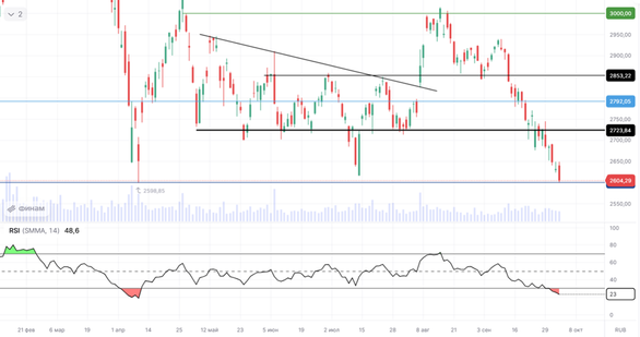 В пятницу, 3 октября, российский рынок закрылся в «красной зоне». Сегодня Зампред ЦБ Алексей Заботкин выступил в прямом эфире РБК, где сказал, что Банк России подтверждает июльский прогноз по средней ключевой ставке на 2026 год в 12-13%. По нашим оценкам, при выполнении этого прогноза ключевая ставка на конец 2026 года может составить 10%, что является благоприятным сценарием для ОФЗ. На эту новость индекс гособлигаций RGBI отреагировал небольшим ростом на 0,04%. Также Заботкин подтвердил, что тенденции к устойчивому ослаблению курса рубля не наблюдается, так как рубль торгуется в районе 80-84 рублей, что является нижней границей диапазона за последние два года. Мы считаем, что текущие уровни являются привлекательными для наращивания среднесрочных позиций в валюте, например, через валютные облигации. Консенсус-прогноз по курсу доллара на конец 2025 года выше 90 рублей за доллар, а драйвером роста спроса на валюту может стать дальнейшее снижение ключевой ставки и рост импорта перед новогодними праздниками. По итогам торгов Индекс МосБиржи снизился на 1,06%, а долларовый индекс РТС — на 2,13%. Среди лидеров роста: «Сургутнефтегаз» (+3,28%), «Фосагро» (+2,55%), «Акрон» (+1,11%). Среди лидеров падения: «Башнефть» (-5,35%), «Самолет» (-3,76%), ВК (-3,69%). Инвесторам, интересующимся российским рынком акций, мы по традиции рекомендуем обратить внимание на стратегию «RU. Капитал и дивиденды». Техническая картина Индекс МосБиржи Индекс пробил все уровни поддержки и теперь подошел к главному уровню сопротивления 2600 пунктов. Учитывая перепроданность — вероятен отскок котировок.