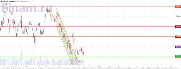 17 ноября 2025 года российский рынок акций сохраняет склонность к продажам, что обусловлено продолжающимися геополитическими и санкционными рисками. Вместе с тем позитивные данные Росстата о замедлении годовой инфляции в октябре несколько поддерживают рынок. Инфляция замедляется уже третью неделю подряд, и такая динамика может ускорить снижение ключевой ставки, что является позитивным сигналом для инвесторов. Однако основным фактором давления на рынок остаются неудачные переговоры «Лукойла» с Gunvor, что привело к закреплению котировок «Лукойла» ниже 5000 рублей. Тем не менее фактором поддержки для российского рынка выступает возобновивший рост цен на нефть. Цена Brent находится на уровне $64,3 за баррель, что способствует стабилизации ситуации. Однако, по оценкам Bloomberg, дисконт на российскую нефть снова начал расти и достиг уже больше $20, что продолжает оказывать давление на нефтяной сектор и бюджет. В целом ситуация на рынке остается двоякой и инвесторы сохраняют скептицизм, но паники быть не должно. По итогам основной сессии индекс Московской биржи упал на 0,55% до 2511,7 пункта, долларовый РТС — на 0,54 % до 975,3 пункта. Курс доллара вырос с 81,12 до 81,13. Лидерами роста сегодня стали бумаги ГК «ПИК» (+10,80%), «Сургутнефтегаза» ао (+1,34%), «Мечела» -ао (+1,22%), ВТБ (+1,03%). В минусе завершили сессию бумаги «Соллерса» (-6,58%), «Лукойла» (-3,79%), Ozon (-2,70%), «Ростелеком» ао (-2,57%). Российские IT-компании с выручкой от 1 млрд рублей в год и больше чем 100 сотрудниками обяжут к 1 июня 2026 года заключить соглашения с вузами для финансовой поддержки и помощи с кадрами. Если этого не сделать, компания потеряет аккредитацию. На этом фоне акции сектора ускорили падение относительно рынка. Акционеры ПИКа не приняли решение по обратному сплиту акций 100:1, на этом фоне их акции растут сильнее всех на рынке. АКРА подтвердило кредитный рейтинг ЮГК на уровне «АА (RU)» со стабильным прогнозом. «Эксперт РА» присвоило рейтинг кредитоспособности МКПАО «Озон» на уровне «ruA», прогноз стабильный. Ozon не исключил потенциального выхода на рынок облигаций на фоне присвоения рейтинга от «Эксперт РА». «ДОМ.РФ» планирует вхождение своих акций в индекс Московской биржи, заявила компания. «Яндекс» объявил цену допэмиссии — 3980,5 руб., что выше текущей цены на 1,8%. Принятое относится к объявленному выпуску до 3,9 млн обыкновенных акций для целей реализации программы долгосрочной мотивации. Инвесторам, интересующимся российским рынком акций, мы по традиции рекомендуем обратить внимание на стратегию «RU. Капитал и дивиденды». Техническая картина Индекс МосБиржи С точки зрения теханализа на дневном графике Индекс МосБиржи тестирует нижнюю границу боковика 2500-2600. Сигналов на пробой уровня поддержи 2500 не наблюдается. По показателю RSI = 36п., индекс уже является слегка перепроданным. Вероятнее всего, будет небольшой отскок и продолжение движение внутри боковика.