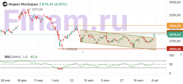 В четверг, 7 августа, российские акции продолжили рост, начавшийся накануне вечером на информации об итогах визита в Москву спецпосланника президента США. По итогам поездки Стивена Уиткоффа и его переговоров в Кремле Дональд Трамп сообщил о «большой вероятности» проведения скорого саммита с президентом России Владимиром Путиным. Ожидается, что сегодня в 23:00 мск Трамп проведет брифинг на эту тему. Помощник президента РФ Юрий Ушаков подтвердил согласование встречи лидеров двух государств и начало подготовки к ней. По его словам, место проведения встречи Путина и Трампа уже согласовано, о нем объявят несколько позже, а следующая неделя была обозначена как возможный ориентир по срокам. Как сообщил накануне вечером Росстат, на неделе с 29 июля по 4 августа снижение потребительских цен в РФ составило 0,13% после снижения на 0,05% с 22 по 28 июля и также на 0,05% с 15 по 21 июля. Впрочем, это скорее сезонное снижение, вызванное летним падением цен на плодоовощную продукцию. Тем не менее годовая инфляция по состоянию на 4 августа замедлилась до 8,77% по сравнению с 9,02 на 28 июля. Между тем, по предварительным данным Минфина, дефицит федерального бюджета РФ в январе-июле резко увеличился и составил 4,9 трлн руб., или 2,2% ВВП, что значительно превышает дефицит в 1,4 трлн руб. за аналогичный период 2024 г. Этот показатель превышает пересмотренный правительством целевой показатель в 1,7% ВВП. Общие расходы правительства выросли на 20,8% в годовом исчислении до 25,19 трлн руб., в то время как доходы увеличились всего на 2,8% до 20,32 трлн руб. По итогам дня рубль снова укрепился. Банк России установил на 8 августа официальный курс доллара 79,3847 (-1,01%), курс евро – 92,6636 (-0,37%), курс юаня – 79,3847 (-1,01%). Котировки золота растут на 0,57% до $3388,45 за унцию. Фьючерсы на нефть марки Brent снижаются на 0,54% до $66,52 за баррель. На этом фоне к завершению дневной сессии Индекс МосБиржи поднялся на 4,04% до уровня 2876,43 пункта, в то время как рассчитываемый в долларах индекс РТС вырос на 5,10% до 1141,45 пункта. В составе индексов большинство акций в плюсе. Отрицательную динамику к завершению дневной сессии показали обыкновенные акции «Ростелекома» (-1,63%), «ЭН+» (-0,81%), ВТБ (-0,74%), ВК (-0,70%) и «Ренессанс Страхования» (−0,65%). В лидерах роста оказались акции «Юнипро», которые выросли на 6,07% после публикации отчетности по МСФО за 6 месяцев 2025 г. Компания увеличила выручку на 1,8% г/г, прибыль и сократилась на 3,7%. Акции «Аэрофлота» прибавили 3,40%. Компания подвела итоги аукциона по продаже бывшего офиса в центре Москвы. Договор будет заключен с компанией, предложившей за лот 1,791 млрд руб. Среди растущих индексных бумаг также заметно выделяются акции «Новатэка» (+4,00%), НЛМК (+2,19%) и «Татнефти» ао (+2,11%) и ап (+2,30%). Группа Ozon (+0,62%) впервые получила не бумажную, а реальную квартальную прибыль по итогам II квартала 2025 года, которая составила 359 млн руб. Общая выручка увеличилась на 87% (г/г) до 227,6 млрд руб. Скорректированный показатель EBITDA составил 39,2 млрд руб. по сравнению с отрицательным значением в размере 0,1 млрд руб. во II квартале 2024 г. Инвесторам, ориентированным на акции отечественных компаний, мы рекомендуем обратить внимание на стратегию «RU. Капитал и дивиденды». Техническая картина Индекс МосБиржи Индекс МосБиржи вырвался вверх из медленно снижавшегося среднесрочного коридора и попытался выйти за отметку 2900 пунктов. Это могло бы стать начало