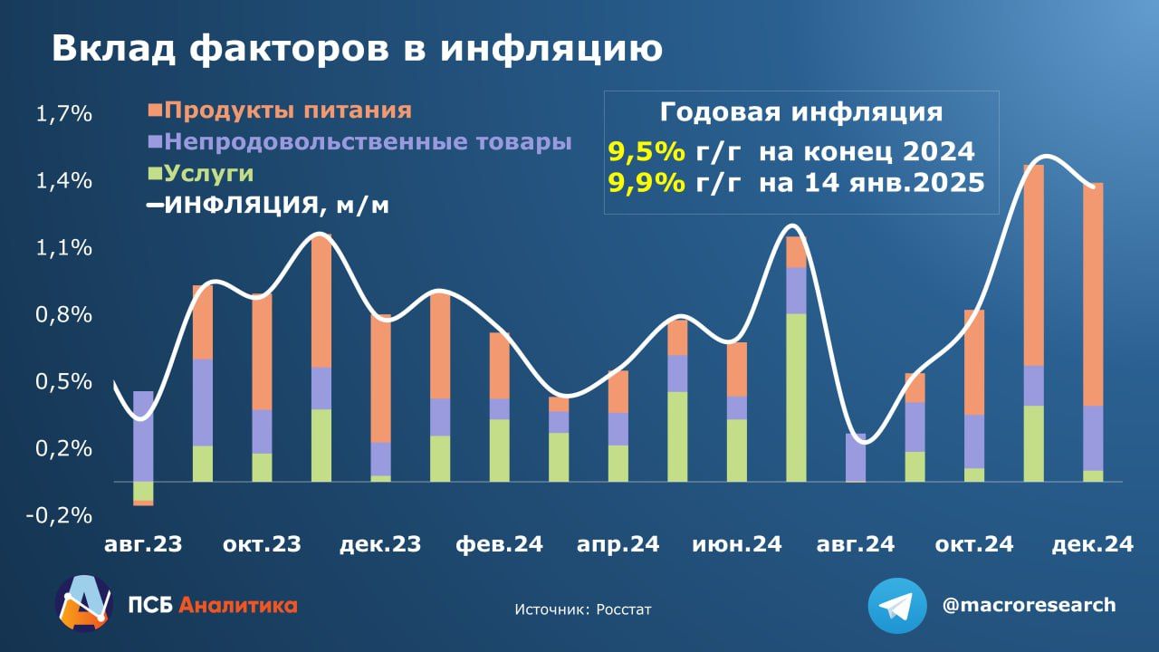 В начале января рост инфляции продолжился - она достигла 9,9% г/г на 14 января. Однако этот рост в основном связан с эффектном низкой статистической базы прошлого года. Динамика цен первых 2 недель января была немного ниже декабрьских недельных данных.
