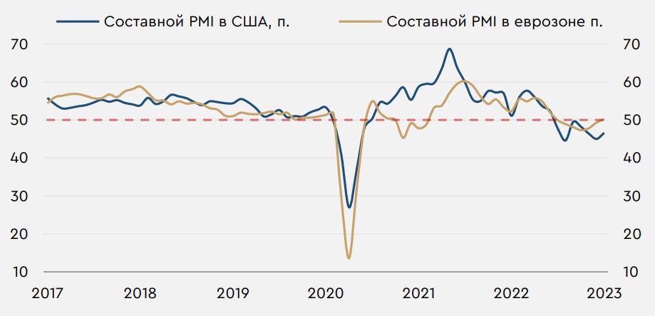 В центре внимания. Во вторник на мировом рынке несколько ослабился спрос на рисковые активы на фоне публикации январских индексов деловой активности в ряде развитых стран (см. развернутый комментарий). На российском рынке вчерашний день прошел без принципиально важных событий. Представители ФРС и ЕЦБ сейчас приостановили свои выступления перед заседаниями на следующей неделе. На этом фоне сегодня в центре внимания мирового рынка будут события сезона отчетностей в США – в частности, сегодня отчитается Tesla. В России среда отметится аукционами Минфина, а также публикацией декабрьского индекса цен производителей и недельных данных по инфляции. Нефть и рубль. Вчера нефтяные цены снизились после публикации индексов деловой активности в США, напомнивших о рисках более слабого спроса на нефть. Во вторник источники СМИ также сообщали, что на встрече мониторингового комитета ОПЕК+ 1 февраля не будут рекомендованы изменения в квотах по добыче картеля. Тем не менее такое решение в целом было ожидаемым и не повлияло существенно на динамику котировок. Сегодня фьючерсы Brent растут и торгуются у $86,1/барр. На динамику котировок сегодня повлияют традиционные недельные данные по запасам в США. По оценке Американского института нефти (API), рост запасов нефти продолжится, но более слабыми темпами. В целом у фьючерсов Brent сохраняется потенциал к росту в сторону $88/барр. Рубль во вторник показал умеренное ослабление. Сегодня курс USDRUB снижается и находится у 68,9 руб./$. Другие курсы валют EM с утра двигаются разнонаправленно. Пик текущего налогового периода придется на 30 января, и во второй половине недели рубль может тяготеть к укреплению. На этом фоне у курса USDRUB сохраняется потенциал к снижению к 68,5 руб./$ к концу недели. Индексы деловой активности S&P Global. Вчерашний день во многом отметился публикацией январских индексов деловой активности в США и еврозоне. Составной показатель в еврозоне за месяц вырос на 0,9 п. до 50,2 п. (прогноз 49,8 п.), впервые с середины прошлого года превысив отметку в 50 п. Напомним, что значения выше этого уровня свидетельствуют о расширении деловой активности, ниже – о ее сокращении. Субкомпоненты индекса указали на ускорившийся рост занятости, резкое улучшение ожиданий бизнеса и снижение темпов роста издержек до минимумов с весны 2021 года. Тем не менее рост отпускных цен в еврозоне ускорился, что напоминает о необходимости дальнейшего роста ставки ЕЦБ. Составной индекс деловой активности в США в январе рос относительно сильнее – на 1,6 п. до 46,6 п. (прогноз 46,4 п.). Тем не менее на фоне снижающегося спроса он пока продолжает находиться заметно ниже 50 п. Субкомпоненты показателя также свидетельствовали о первом более чем за полгода ускорении роста затрат, хоть и отпускные цены продолжили расти прежними темпами. Таким образом, экономическая активность в США остается слабой, что в условиях сохраняющейся жесткости ФРС усиливает риски более сильного снижения американской экономики.