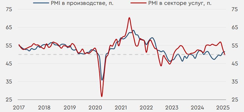 Мировой рынок закончил прошедшую неделю в минусе. Инвесторы реагировали на неопределенность в геополитической сфере, а также на ряд слабых данных, показавших в том числе неожиданное падение составного PMI в США до минимума с сентября 2023 года. На российском рынке продолжил превалировать заметный позитив. Помимо геополитического фактора, этому способствовала и статистика, показавшая, помимо прочего, первое с сентября снижение инфляционных ожиданий населения РФ. В ближайшие дни в центре внимания останутся геополитические новости. На глобальный рынок также способны повлиять экономические данные, в первую очередь – январский ценовой индекс PCE, который таргетирует ФРС, и уточненная оценка ВВП США за 2024 год. Динамика российского рынка продолжит определяться геополитическими новостями, в том числе в разрезе санкций, которые должны в ближайшее время ввести страны ЕС. Впрочем, на этой неделе также выйдет целый ряд значимой статистики. Так, ЦБ опубликует январские данные по кредитованию, февральские цифры по потребительским настроениям и резюме февральского заседания, которое способно дать больше сигналов о дальнейших решениях регулятора. Нефть и рубль По итогам прошлой недели цены на нефть снизились. Большую часть недели котировки показывали восходящую динамику, но в пятницу они упали на фоне относительно слабых цифр по PMI в ряде развитых стран и геополитических новостей, снизивших в моменте опасения перебоев в поставках. Сегодня фьючерсы Brent торгуются у $74,4/барр. В целом у котировок есть потенциал к возврату выше $75/барр. в зависимости от развития геополитической ситуации. Рубль на прошедшей неделе укреплялся, но не столь выражено, как было неделей ранее. Геополитические новости продолжают играть на стороне рубля, в этих условиях эффект от крайне высокого дифференциала процентных ставок усиливается. Сегодня курс CNYRUB находится у 12,09 руб./юань. Другие курсы валют EM с утра двигаются разнонаправленно. В целом курс может вновь на время уходить ниже 12 руб./юань, но неделю он должен закончить выше этого уровня, в том числе на фоне завершения налогового периода. Деловая активность в США Пятничные данные от S&P Global показали, что в феврале составной PMI в Штатах снизился с 52,7 сразу до 50,4 п. (прогноз 53,2 п.), до минимума с сентября 2023 года. Значения выше 50 п. указываю на рост деловой активности, ниже – на ее сокращение. Производственный PMI за месяц вырос на 0,4 п. до 51,6 п. (прогноз 51,5 п.), но индекс по услугам упал с 52,9 сразу до 49,7 п. (прогноз 53,0 п.). Давление на показатели оказало ослабление спроса, особенно заметное в сфере услуг. Рост издержек в США ускорился до максимума с сентября, но темпы роста отпускных цен, наоборот, были минимальными с ноября. В результате пятничные данные способны усиливать аргументы за более ранее снижение ставки ФРС, но риски, связанные с политикой тарифов и пошлин, пока остаются слишком высокими для американского регулятора. Индексы деловой активности в США