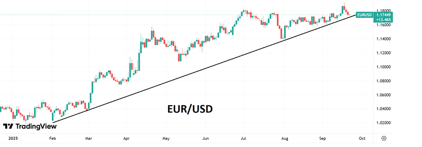 Благодаря восстановлению индекса доллара со среды по пятницу, ему удалось закрыть прошлую неделю с нейтральной динамикой возле отметки 97,7 – так инвесторы отреагировали на первое в этом году снижение ставки ФРС и обновленный экономический прогноз. То, что инвесторы быстро выкупили снижение доллара до 96,2, открывает дорогу для его дальнейшего восстановления. Этим утром пара EUR/USD торгуется в районе 1,174 и снижение ниже 1,17 может привести к усилению снижения европейской валюты. Этим утром британский фунт слегка корректирует то сильное снижение, которое мы видели в конце прошлой недели – сейчас торги идут в районе 1,348. Японская иена продолжает оставаться в ценовом диапазоне, сформированном к доллару за последние полтора месяца: 146,5-148,5. Китайский юань стабилизировался возле 7,114, готовый к новому укреплению против доллара, если тот покажет слабость. Напомним, что на прошлой неделе в среду ФРС снизила ставку по федеральным фондам на 25 б.п., как и ожидалось, одновременно спрогнозировав еще 50 б.п. возможного снижения в этом году, а также на 25 б.п. в 2026 году. На итоговой пресс-конференции после заседания глава ФРС придерживался осторожного тона, назвав этот шаг снижением в целях «управления рисками» и предупредив, что нет предопределенного графика смягчения ДКП. ФедРезерв на прошлой неделе пересмотрел прогнозы роста ВВП США в сторону повышения, подчеркнув устойчивость экономики, что подтвердили свежие данные по первоначальным заявкам за пособиями по безработице, которые оказались значительно ниже ожиданий. Это говорит о том, что слабость рынка труда может быть не столь выраженной, как многие опасались. Этот фактор на прошлой неделе поддержал спрос на доллары. Выступивший в пятницу президент ФРС Миннеаполиса Нил Кашкари заявил, что поддерживает решение о снижении ставки на 25 б.п. и хотел бы увидеть еще два снижения в этом году. На этой неделе Джером Пауэлл и около девяти других политиков из ФРС должны выступить, и рынки будут внимательно следят за их прогнозами относительно перспектив ставки. Пошлины на импорт в США товаров из большинства стран, введенные администрацией президента Дональда Трампа, не оказали существенного влияния на инфляцию - считает новый член совета управляющих ФРС Стивен Миран. Вообще он выделяется из остальных, своей позицией по поводу незначительности влияния тарифов на цены, что контрастирует с общепринятыми взглядами. Миран был единственным членом FOMC, который в сентябре проголосовал за снижение ставки ФРС на 50 б.п. Миран выступает за пересмотр структуры и мандата ФРС, критикует избыточное расширение функций регулятора и "групповое мышление" в принятии решений. На прошлой неделе Конгресс США близок к временной приостановке работы правительства с 1 октября (shutdawn), поскольку 19 сентября демократы и республиканцы в Сенате заблокировали планы друг друга по предоставлению временного финансирования. Демократы требовали увеличить расходы на здравоохранение, в то время как республиканцы отказываются поддержать простой законопроект, который позволит сохранить работу до 21 ноября. В итоге, Палата представителей 217 голосами против 212 одобрила законопроект о продлении временного финансирования работы правительства еще на 2 месяца. На этом фоне цены на золото в понедельник достигли исторического максимума в $3714/унц,